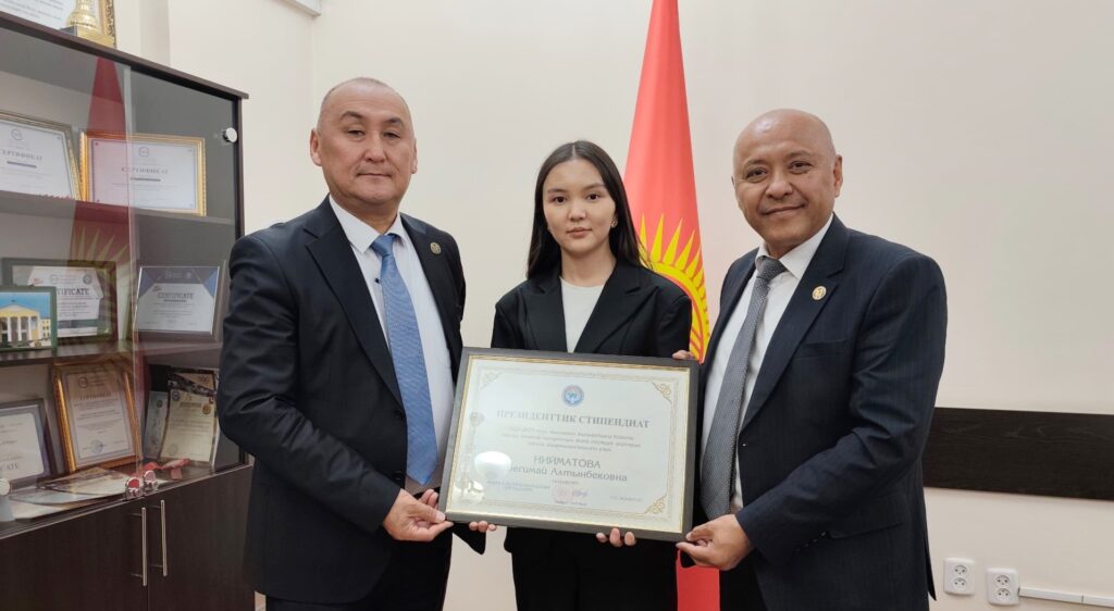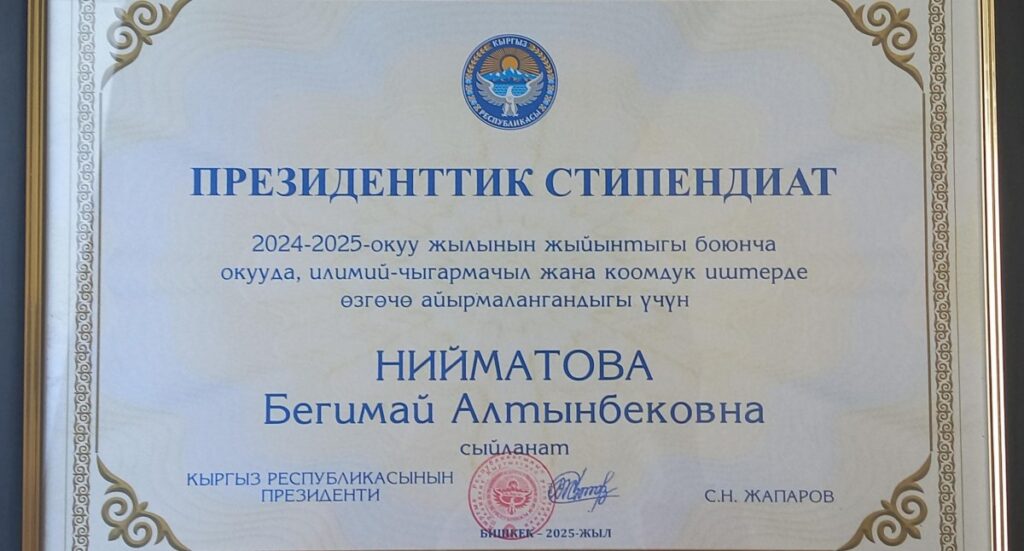 Математика жана информатика институтунун директораты студенттик кеңештин мүчөсү, 4-курстун студенти Бегимай Нийматованы окууда, илимий-чыгармачыл жана коомдук иштерде өзгөчө айырмалангандыгы үчүн Кыргыз Республикасынын Президентинин стипендиясына татыктуу болушу менен чын жүрөктөн куттуктайт.