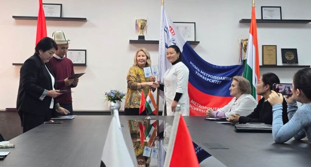 2025-жылдын 12-ноябрында Кадрларды кайра даярдоо жана квалификацияны жогорулатуу институтунун директорунун орун басары Айсулу Парманасова менен квалификацияны жогорулатуу бөлүмүнүн башкы адиси Адилет Самсалиев “Роэль Метрополитен Университет” билим берүү мекемесинин профессордук-окутуучулар курамына квалификацияны жогорулатуу жөнүндө күбөлүктөрдү тапшырып келишти.