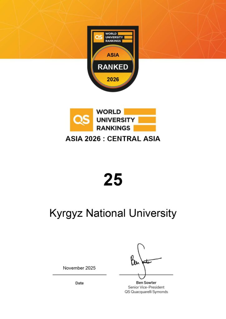 Азиянын эң мыкты университеттеринин жаңы рейтинги QS Asia University Ranking 2026 жарыяланып, анда Кыргызстандын 6 жогорку окуу жайы татыктуу орундарды ээледи: