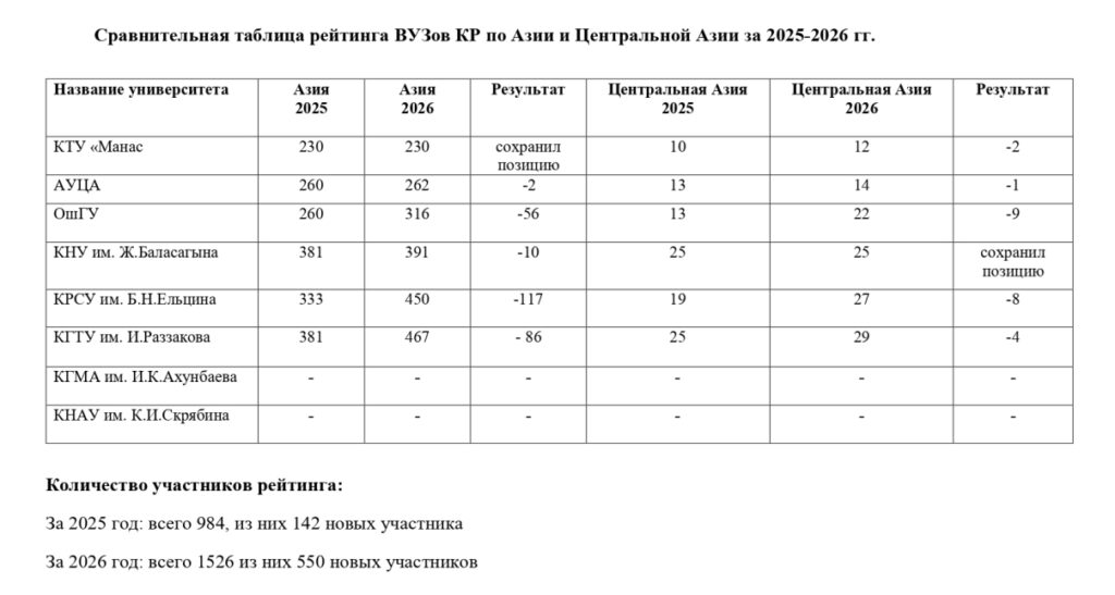 Эгер өткөн жылы рейтингге Азиянын 984 жогорку окуу жайы катышып, быйыл алардын саны 1526га (+542) жеткенин жана башка жогорку окуу жайлардын рейтинги 56 (ОшМУ), 86 (КМТУ) жана 117 (КРСУ) позицияга төмөндөгөнүн эске алсак, Улуттук университет бул рейтингде татыктуу орунду ээлегени байкалып турат.