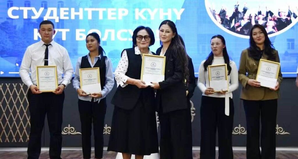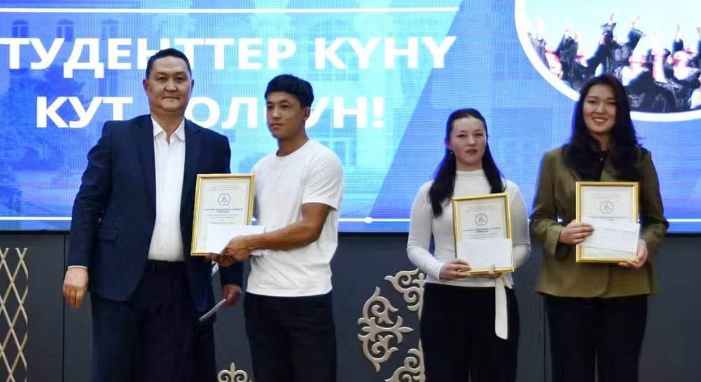 Салтанаттын жүрүшүндө Ж. Баласагын атындагы Кыргыз улуттук университетинин 100 жылдык мааракесинин алкагында өткөрүлгөн иш-чараларга жигердүү катышкан студенттерге ректордун ыраазычылык каттары тапшырылды.