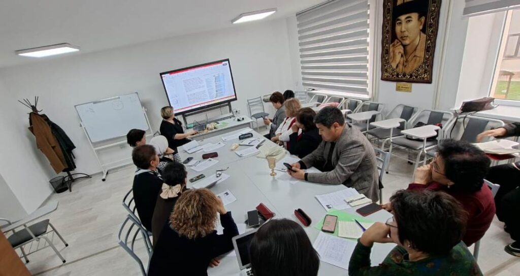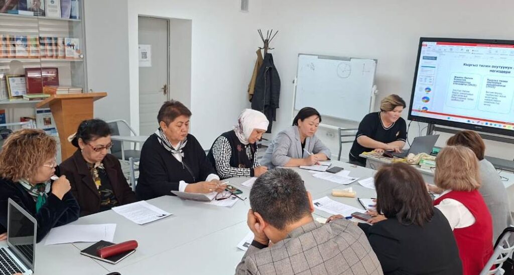 Жыйынды аталган министрликтин мектептик билим берүү башкармалыгынын жетектөөчү адиси Г.У.Ибраимова алып барды. РИППКнын ага окутуучусу Р.У.Ибраимова “Кыргыз тилин эне тил катары окутуунун абалы боюнча талдоо жана сунуштар” деген темада презентация жасады.