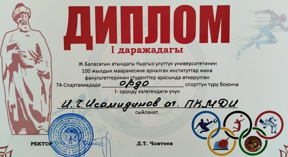 Ж.Баласагын атындагы КУУнун 100 жылдык мааракесине арналган институттар жана факультеттердин студенттеринин арасында өткөрүлгөн 74-спартакиадада И.Ч.Исамидинов атындагы педагогикалык институттун “Дене тарбия жана спорт” багытындагы студенттеринин командасы улуттук спорттун Ордо түрү боюнча 1-орунду жеңип алгандыгы учун 1-даражадагы диплом менен сыйланды.
