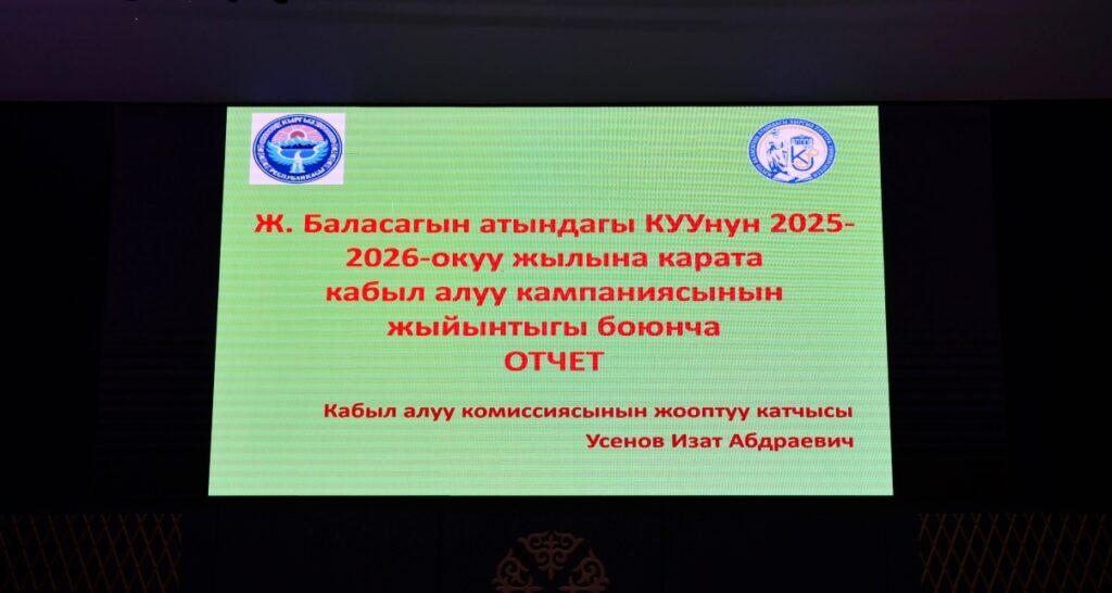 2025-жылдын 5-декабрында Жусуп Баласагын атындагы Кыргыз улуттук университетинин Окумуштуулар кеңешинин кезектеги отуруму болуп өттү. Жыйынды аталган кеңештин төрагасы, КУУнун ректору, профессор Догдурбек Чонтоев алып барды.