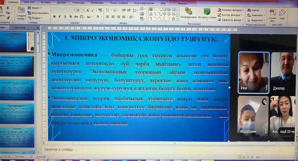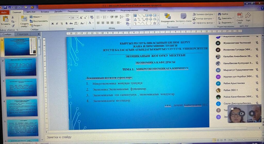 3-сентябрь, 2025-жыл КУУда. Ж.Баласагын атындагы КУУнун Экономика жогорку мектебинин «Экономика» кафедрасынын базасында «Микроэкономика» окуу сабагынын алкагында «Экономика» багыты боюнча бакалавриат студенттери үчүн «Микроэкономикага киришүү»деген темада онлайн-лекция өткөрүлдү. Лекция микроэкономикалык анализдин негизги теориялык жана практикалык аспектилерине, экономикалык агенттердин жүрүм-турумун жана рынок механизмдеринин иштешин түшүнүүдө анын маанисине арналган.