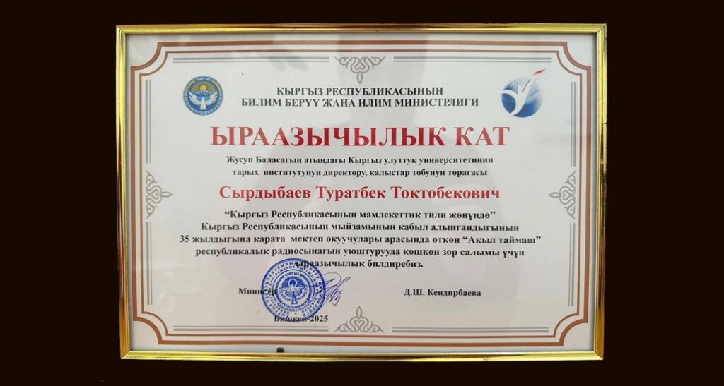 2025-жылдын 29-декабрында Тарых жана чөлкөм таануу институтунун мурдагы директору, тарых илимдеринин кандидаты, профессор Сырдыбаев Туратбек Токтобековичтин үй-бүлөсүнө Кыргыз Республикасынын Агартуу министри Догдуркүл Кендирбаеванын Ыраазычылык каты тапшырылды.