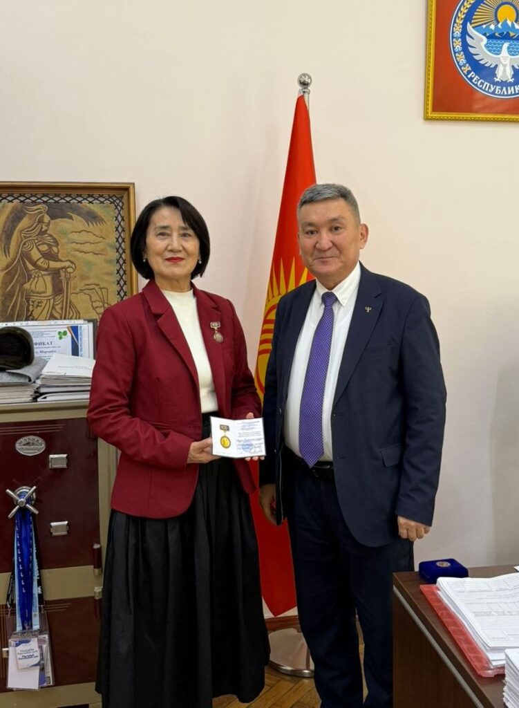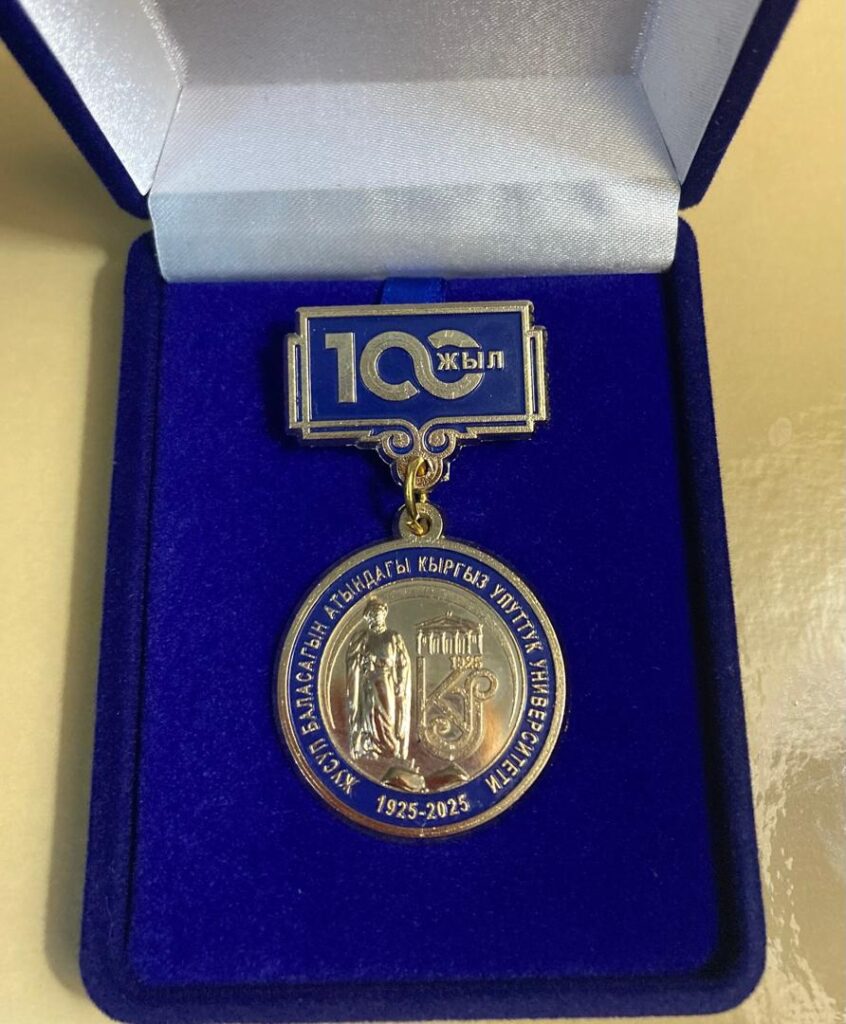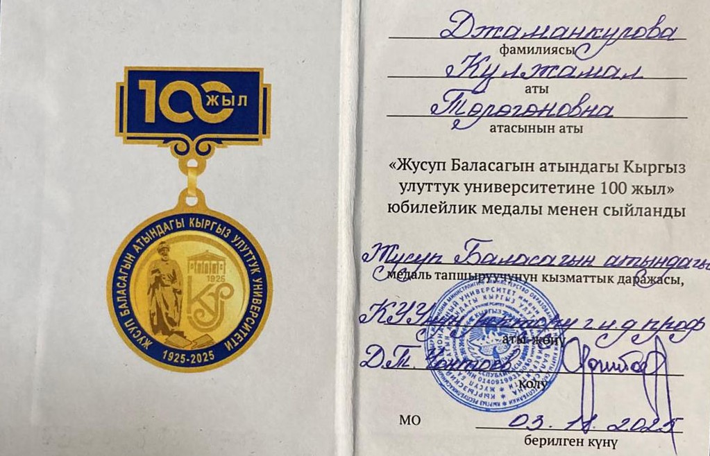 Кыргыз тил илими кафедрасынын профессору Гүлжамал Жаманкулова Ж.Баласагын атындагы КУУнун ректору, професоор Догдурбек Чонтоевдин 2025-жылдын 26-декабрындагы буйругу менен «Ж.Баласагын атындагы Кыргыз улуттук университетине 100 жыл» юбилейлик медалы менен сыйланды.