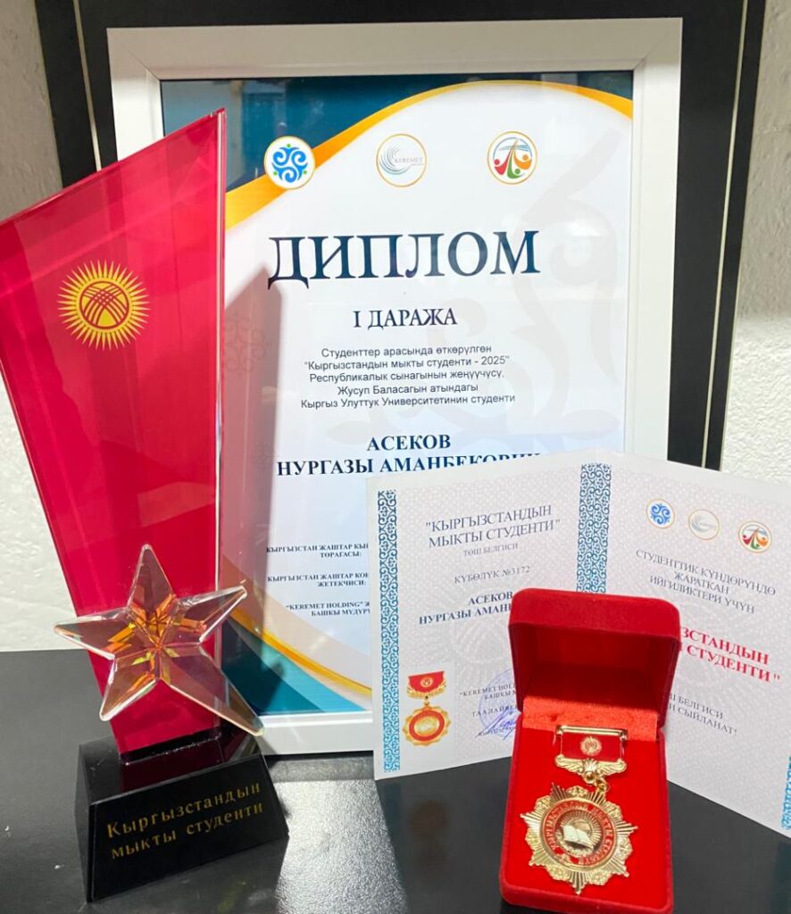 География, экология жана туризм факультетинин “Экология” багытындагы 3-курс студенти Нургазы Асеков “Keremet Holding” жана Кыргызстан жаштар конгресси тарабынан уюштурулган «Кыргызстандын эң мыкты студенти — 2025» республикалык сынагына катышып, I даражадагы диплом жана «Эң мыкты студент» наамына татыктуу болуп, «Кыргызстандын мыкты студенти» төш белгиси, күбөлүгү жана статуэткасына ээ болуп келди.