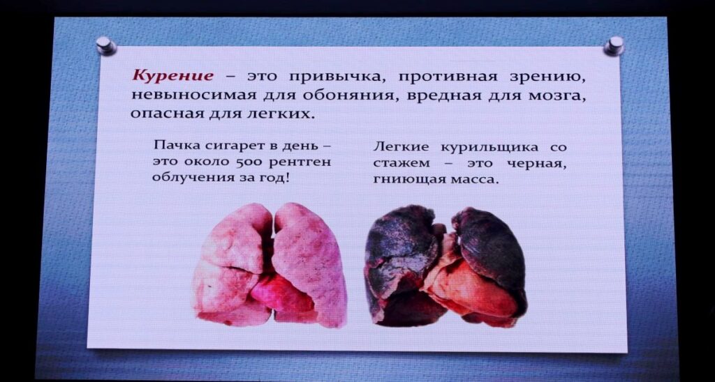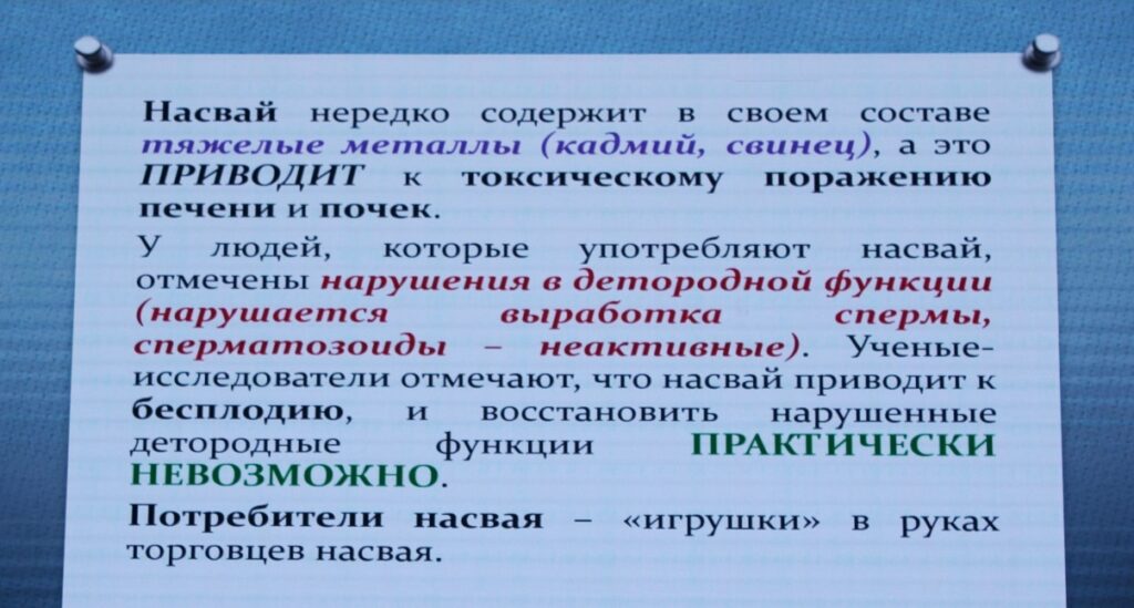 Дастан Кушубеков өз баяндамасында насвай, вейп, тамеки жана кальяндын курамындагы зыяндуу химиялык заттар организмге кандайча таасир этээрин мисалдар менен түшүндүрүп, айрыкча жаш куракта никотинге көз карандылык тез калыптанып, мээнин, дем алуу жана жүрөк-кан тамыр системаларынын иштешине олуттуу зыян алып келээрин баса белгиледи жана вейп менен кальянды «коопсуз» деп эсептөө жаңылыш пикир экенин, алардын ден соолукка тийгизген зыянын далилдер менен көрсөтүп берди.