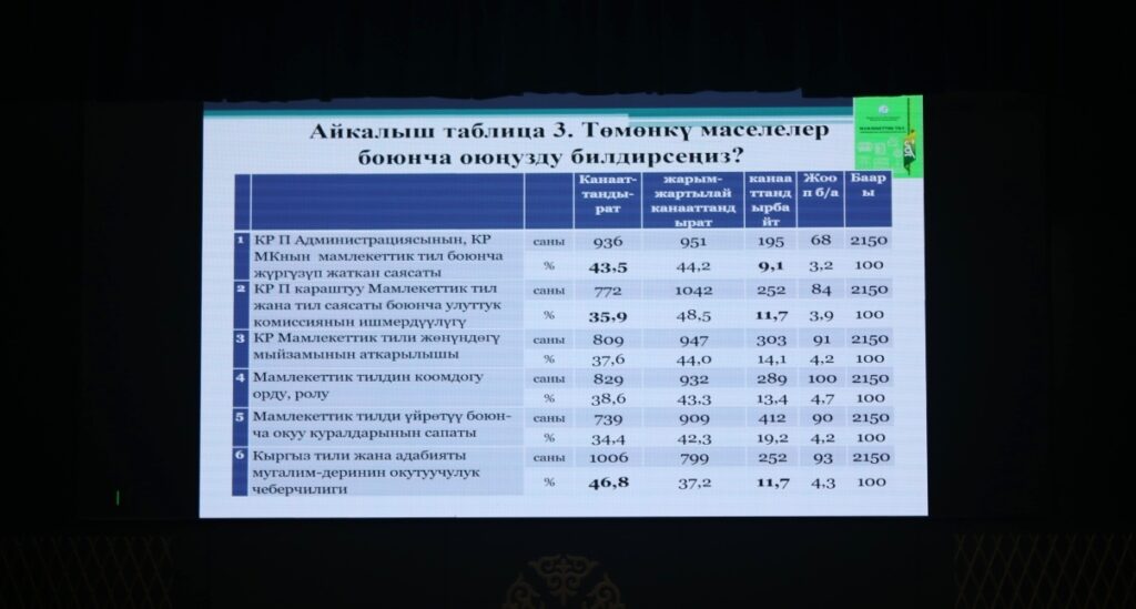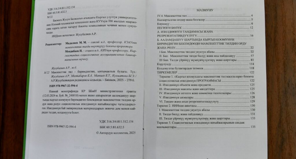 Илимий монографиянын жарык көрүшү жана бет ачары менен Мамлекеттик тил жана тил саясаты боюнча улуттук комиссиянын мониторинг жана талдоо бөлүмүнүн башчысы Гүлнур Капарова куттуктаган соң, китептин авторлору, Социалдык-гуманитардык илимдер институтутун директору, социология илимдеринин кандидаты, доцент Абдикакйым Жусубалиев «Мамлекеттик тил – улут деминин руханий азыгы», ал эми СГИИнин социология жана социалдык иштер кафедрасынын башчысы, социология илимдеринин кандидаты, доцент Бакытбек Малтабаров «Жарандардын мамлекеттик тилди билүү жана колдонуу абалы» деген темада баяндамаларды жасашты.