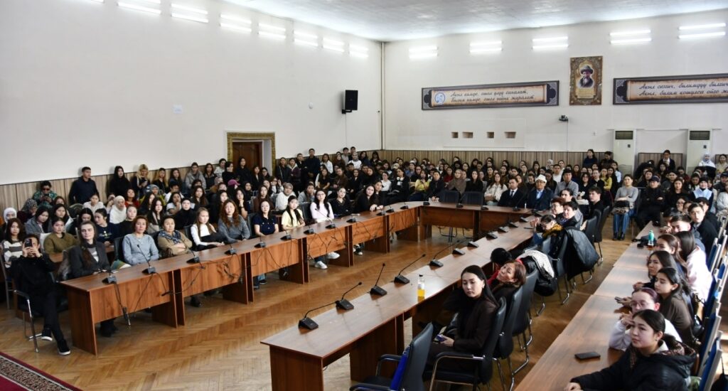 Жолугушуу жандуу жана интерактивдүү форматта өтүп, студенттер өздөрүн кызыктырган суроолорду берип, мазмундуу пикир алышуу болду.