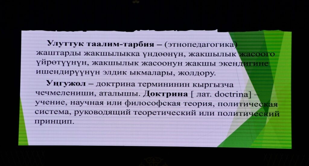 - Жеңиш Чыманов — п.и.д., профессор: «Улуттук дем — дүйнөлүк бийиктик» уңгужолунун талаптары кыргыз тили жана кыргыз адабияты сабактарында»;