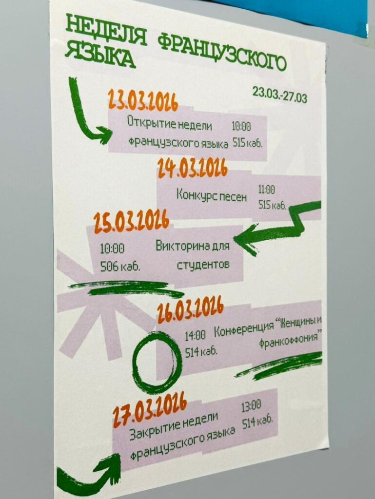 2026-жылдын 23–27-март күндөрү Чет тилдер институтунда роман-герман тилдери кафедрасы (француз тили) тарабынан француз тилинин жумалыгы өзгөчө шыктандыруучу маанайда, мазмундуу жана жогорку деңгээлде ийгиликтүү өткөрүлдү.
