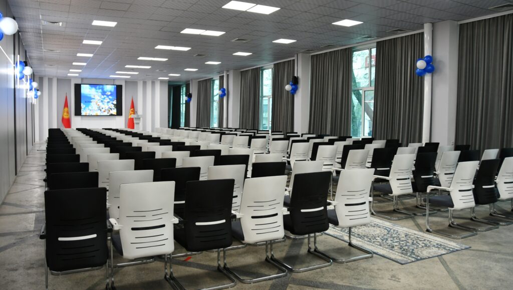 Эскерте кетсек, жаңы конференц-зал А.Табалдиев атындагы илимий китепкананын окуу залынын оң тарабынан орун алды.