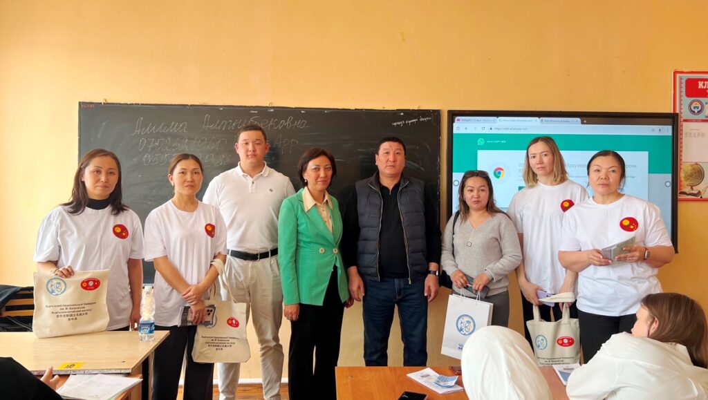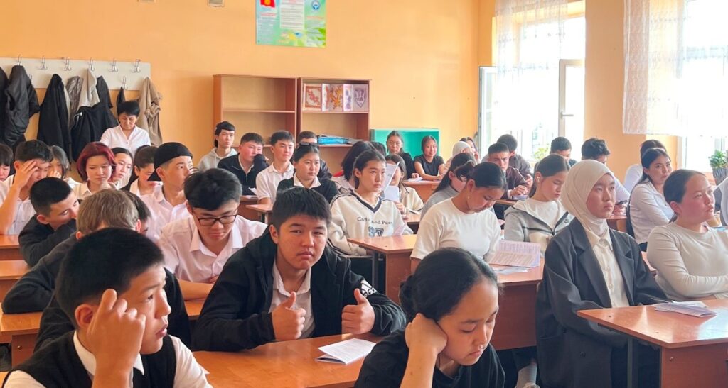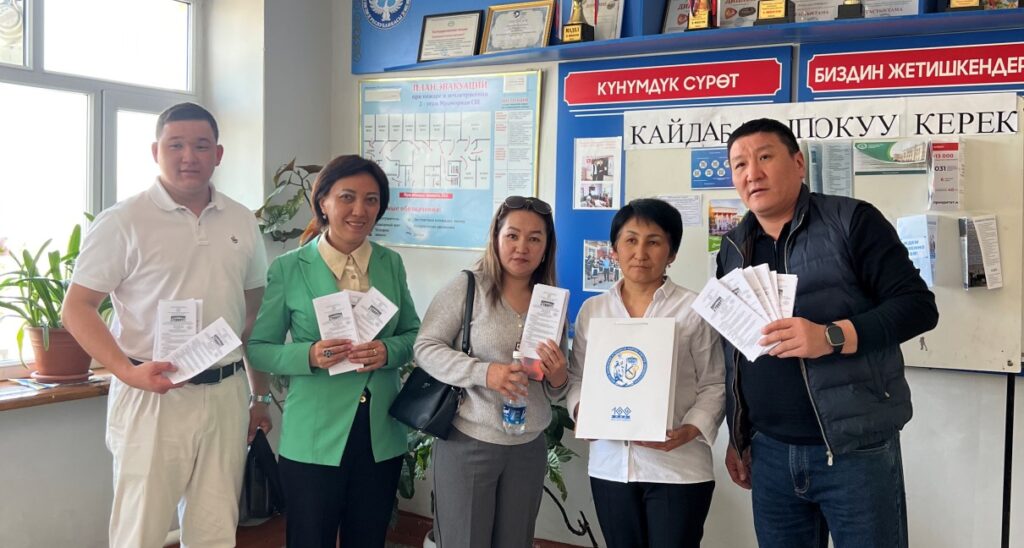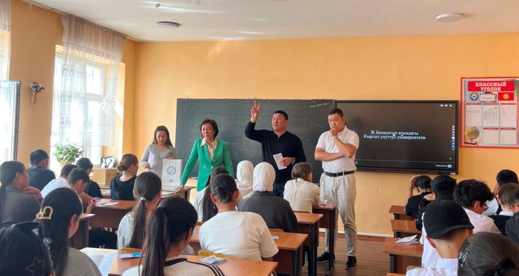 Алар мектептин бүтүрүүчү класстарынын окуучуларына институт жөнүндө маалымат беришип, буклеттерди таркатышты жана кыска видеороликтерди көрсөтүштү. Пединституттун өкүлдөрү о.э. окуучулардын суроолоруна жооп беришип, аларды кесипти туура тандоого үндөштү.