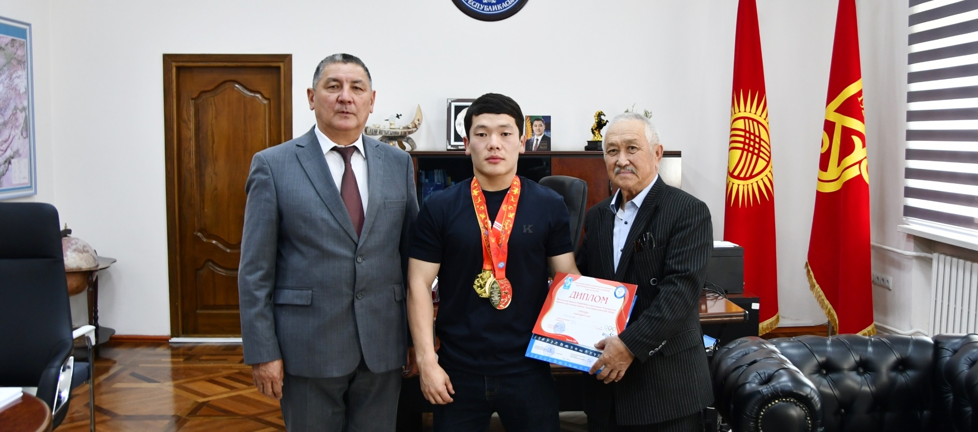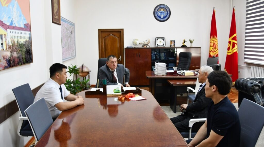2026-жылдын 27-апрелинде КУУнун ректору, профессор Догдурбек Чонтоев Олимпиада чемпиону, КУУнун факультеттер аралык дене тарбия жана спорт кафедрасынын профессору, Дастандын машыктыруучусу Каныбек Осмоналиев жана И.Ч.Исамидинов атындагы педагогикалык институттун 1-курс студенти, спорт чебери Дастан Иманалиев менен жолугушту.