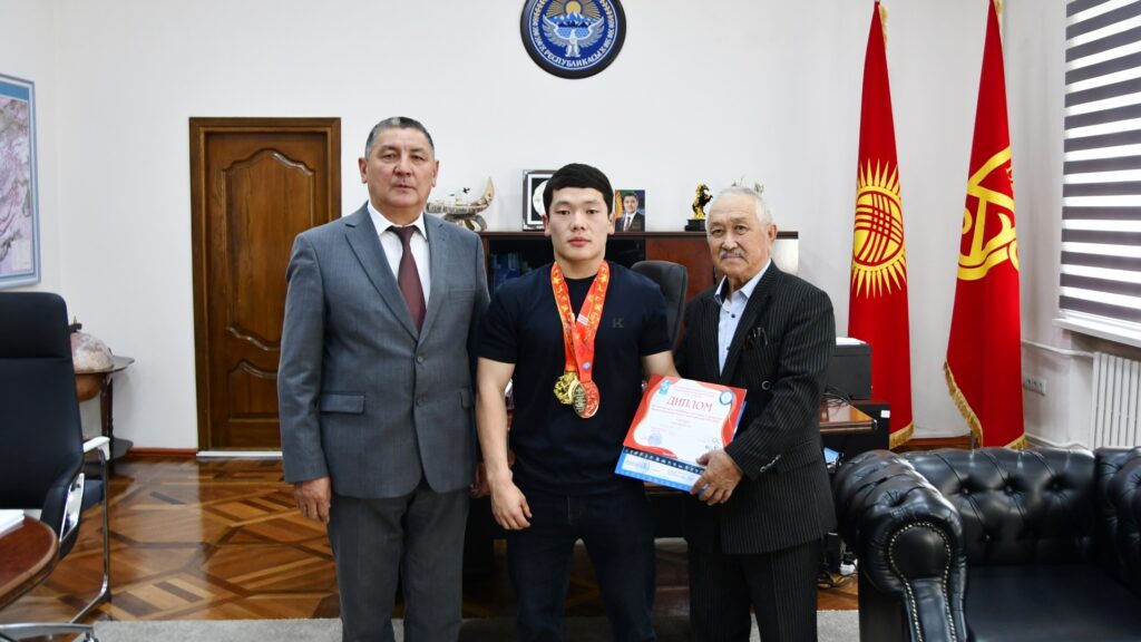 Ректор Улуттук университеттен оор атлетика боюнча дүйнөнүн төрт жолку чемпиону Каныбек Осмоналиев сыяктуу спортчулардын жолун улаган жаштардын чыгып жатышы сыймык экенин белгилеп, алдыдагы эл аралык мелдештерде ийгиликтерди каалады.