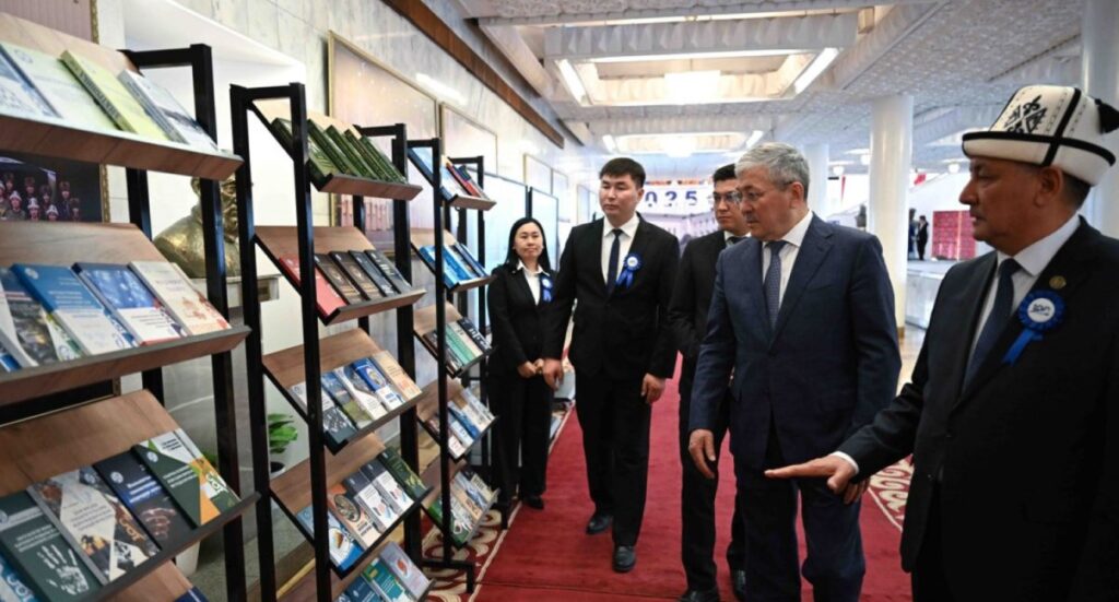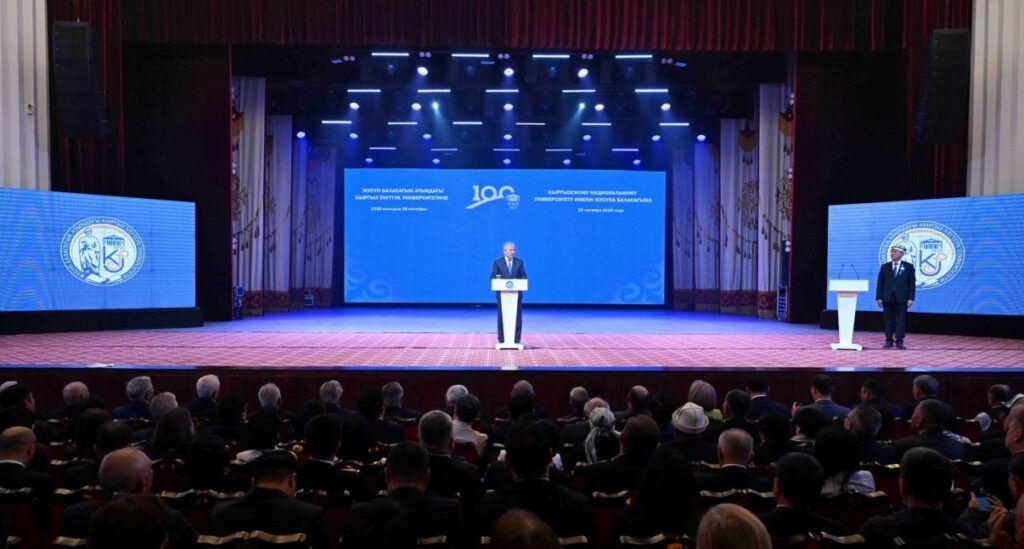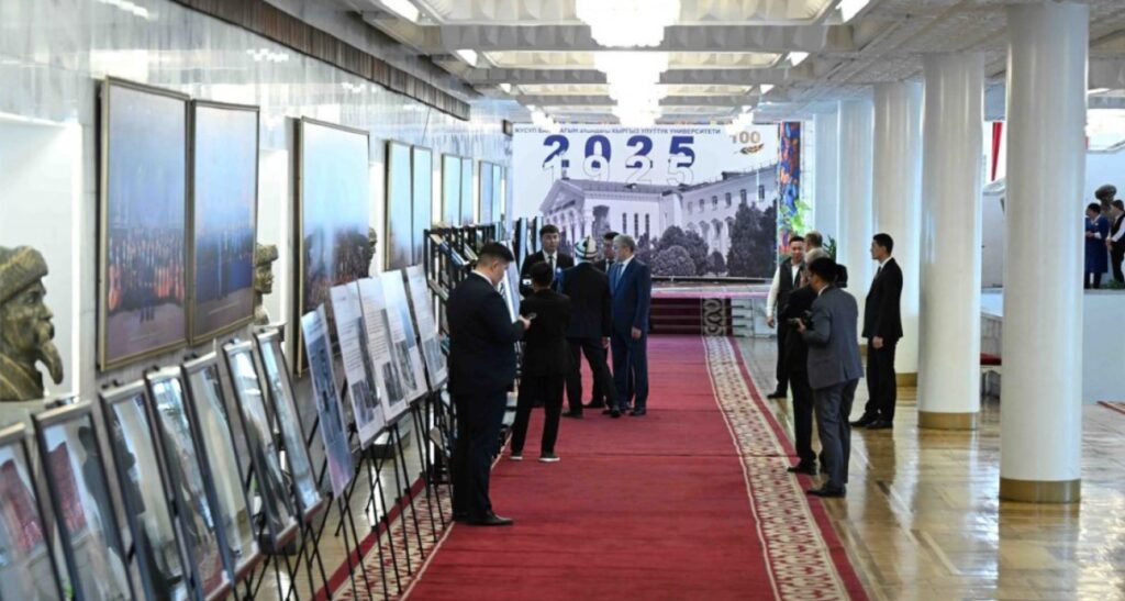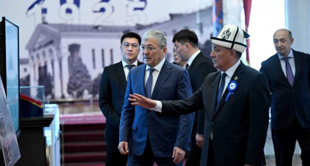 On October 25, 2025 the Chairman of the Cabinet of Ministers of the Kyrgyz Republic – Head of the Presidential Administration Adylbek Kasymaliev attended a solemn event dedicated to the 100th anniversary of the Kyrgyz National University named after Jusup Balasagyn. The Chairman of the Cabinet of Ministers Adylbek Kasymaliev got acquainted with the exhibition organized for the 100th anniversary of the university, after which a film and a theatrical prologue dedicated to the anniversary were shown.