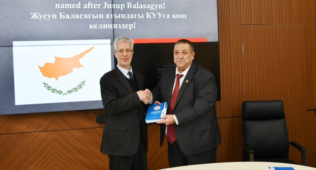 On December 9, 2025 Alaybek Shamshiev, First Vice-Rector and Vice-Rector for Academic Affairs at Kyrgyz National University named after Jusup Balasagyn, met with Kypros Yorgallis, Ambassador Extraordinary and Plenipotentiary of the Republic of Cyprus to the Kyrgyz Republic.