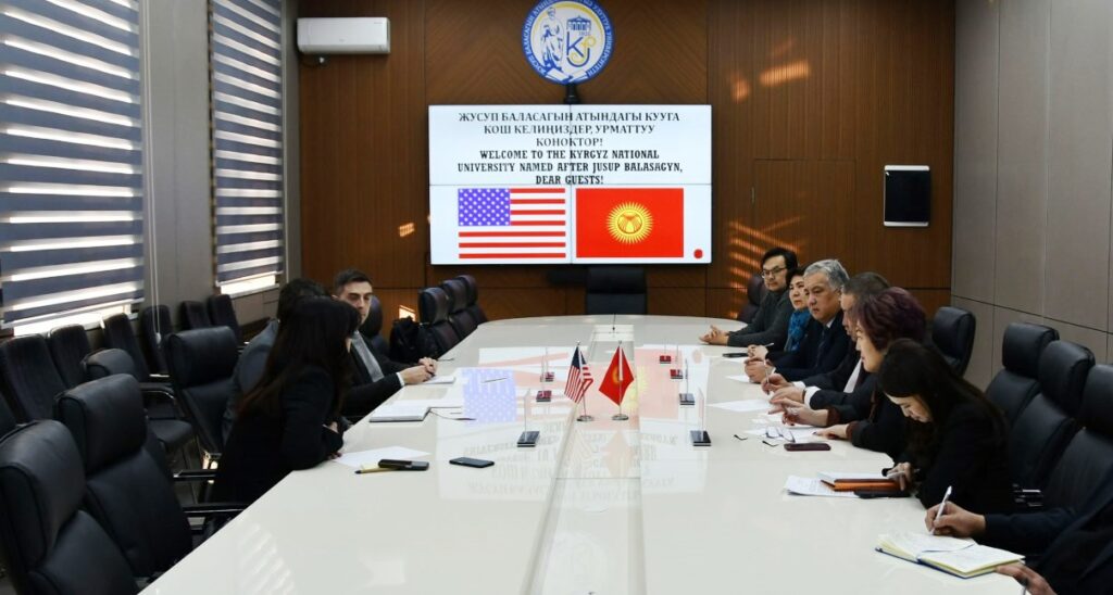The meeting was also attended by Jacob Williams, Cultural Affairs Officer at the US Embassy, Aigerim Kurmanalieva, Coordinator of the American Corner, Bakyt Keldibekov, Director of the Department of International Cooperation and Relations at KNU, Esen Usubaliev, Dean of the Faculty of International Relations and Oriental Studies, and Medina Nukeeva, Dean of the Kyrgyz-European Faculty.
