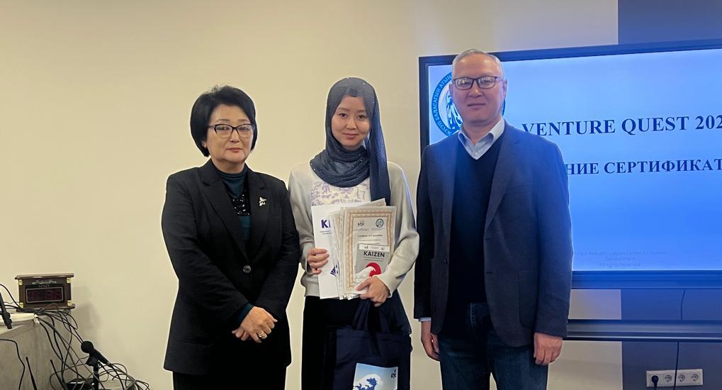 Following the three-stage training seminars, an awards ceremony was held for the best teams. Almazbek Azimov, Co-Director of the Kyrgyz-Japanese Center for Human Resources Development (KRJC), and Gulbara Bekturganova Sydykova, Vice-Rector for Investments at KNU, presented the winners with training certificates.