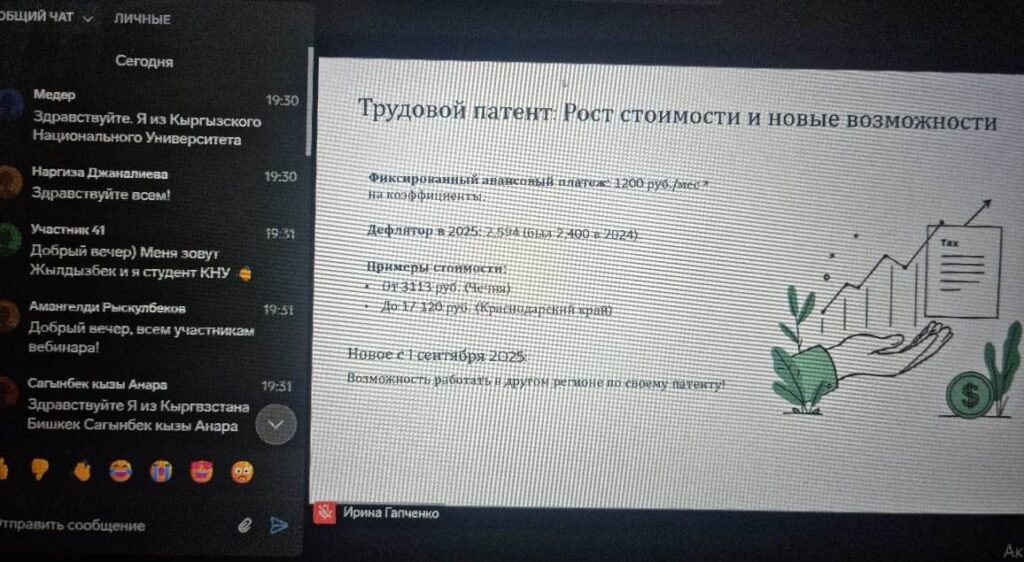 Вебинар был посвящен актуальной и социально значимой теме: «Правовое регулирование труда граждан Кыргызской Республики на территории Российской Федерации: последние изменения». В качестве экспертов выступили лекторы из Российской Федерации, представляющие Автономную некоммерческую организацию «Люди труда»: Татьяна Терещенко и Ирина Гапченко.