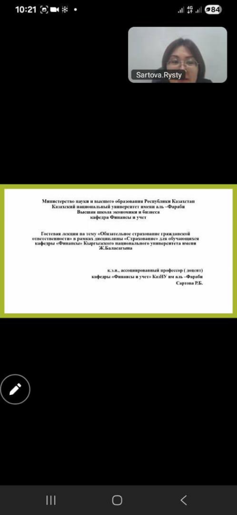 4 ноября 2025 года в рамках реализации Договора о сотрудничестве между Казахским национальным университетом имени аль-Фараби и Кыргызским национальным университетом имени Жусупа Баласагына, а также программы академической мобильности с применением дистанционных образовательных технологий, стартовала серия гостевых лекций для студентов Высшей школы экономики по дисциплине «Страхование», которая продлится с 4 по 12 ноября 2025 года.