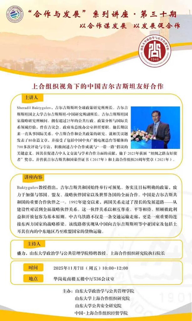 Кроме того, в Шандунском университете (г. Циндао) Ш.Бактыгулов провёл лекцию об особенностях сотрудничества Кыргызстана и Китая, а также о подходах деятельности ШОС. В рамках этой работы он был назначен старшим исследователем Института изучения ШОС Шандунского университета.