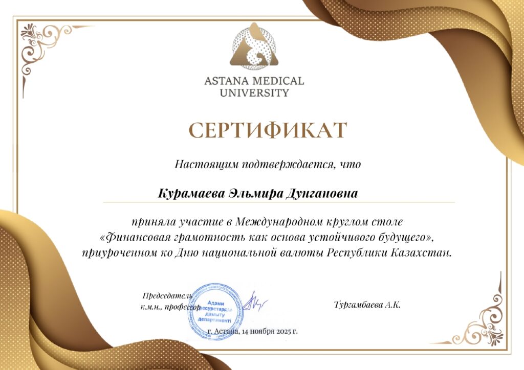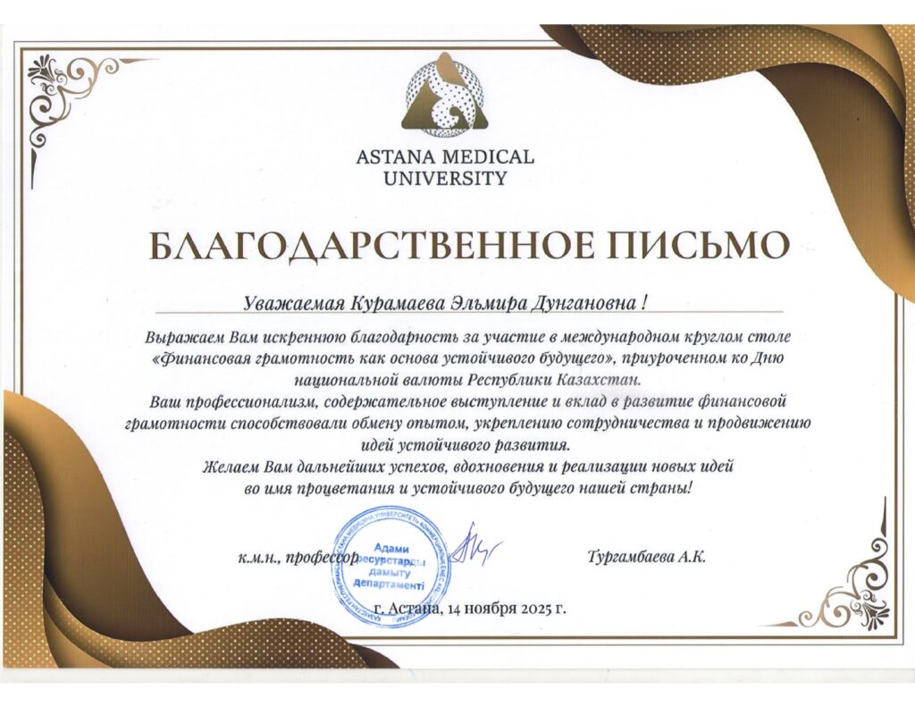 14 ноября 2025 года доцент кафедры «Банковское дело и налогообложение» Курамаева Эльмира Дунгановна приняла участие в работе Международного круглого стола на тему: «Финансовая грамотность как основа устойчивого будущего», приуроченного ко Дню национальной валюты Республики Казахстан.