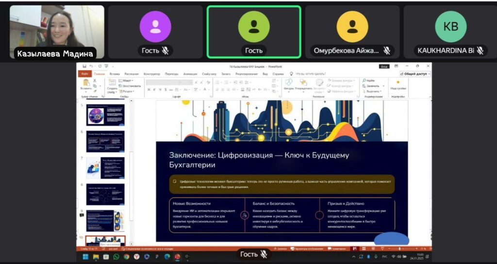 - Студентка 4 курса кафедры БУАиА Кызылаева Мадина с докладом на тему «Цифровизация бухгалтерского учета: преимущества, риски и перспективы» (науч. рук. – к.э.н. доцент кафедры БУАиА Бятова Каухар-Дина Викторовна).