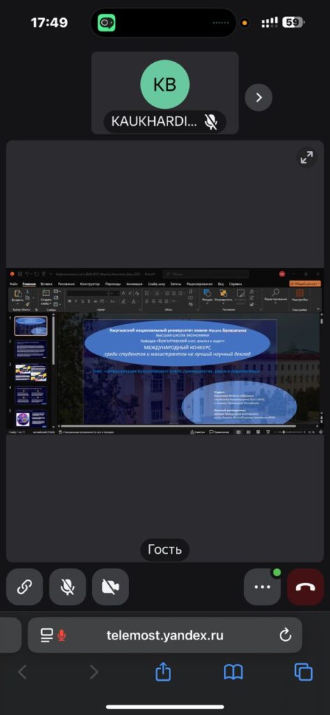 - Студент 4 курса кафедры БУАиА Азизов Урмат с докладом на тему «Роль аудита в обеспечении достоверности финансовой информации: современные вызовы и решения» (науч. рук. – к.э.н. доцент кафедры БУАиА Бятова Каухар-Дина Викторовна);