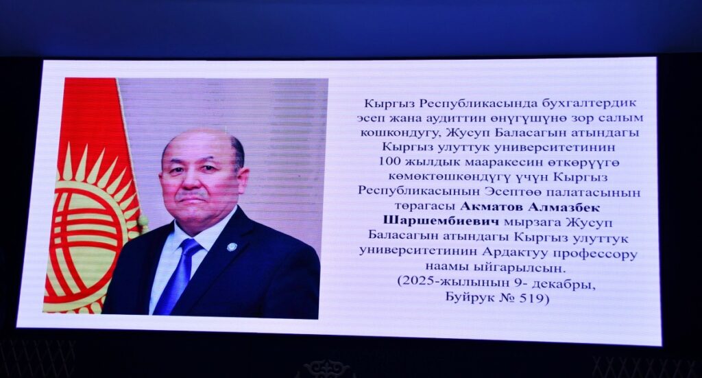 18 декабря 2025 года в Кыргызском национальном университете имени Жусупа Баласагына состоялась гостевая лекция Председателя Счётной палаты Кыргызской Республики Акматова Алмазбека Шаршембиевича на тему «Государственный финансовый контроль как ключевой инструмент устойчивого развития Кыргызской Республики».