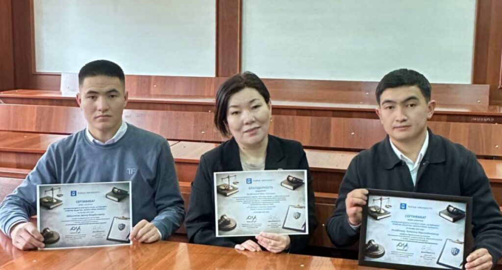 Студенты 4 курса очного обучения по направлению «Юриспруденция» Абдыллаев Эрнис и Аскарбеков Кутман получили сертификаты, а преподаватель кафедры уголовного процесса и судебной экспертизы Айна Аязбекова — благодарность за организацию круглого стола, которое состоялось 10 декабря 2025 года на тему: «Устойчивое развитие общества: закон и права человека» в университете «Туран» (г. Алматы, Казахстан), посвященный ко дню принятия Всеобщей декларации прав человека Генеральной Ассамблеи ООН. В мероприятии участвовали представители вузов России, Казахстана, Белоруссии и Кыргызстана.