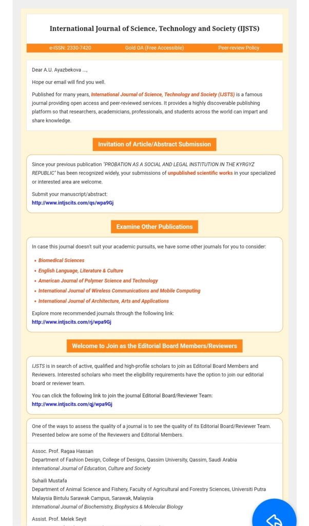 Кроме этого, Айна Аязбекова была приглашена в качестве члена редакционной коллегии научного журнала: «International Journal of Law and Society» (ISSN; Online: 2640-1908; ISSN Print: 2640-1894) г. Нью-Йорк, США, издающийся уже много лет, который является известным журналом, предоставляющим услуги открытого доступа и рецензирования (https://www.sciencepg.com/journal/306/reviewers). Он предоставляет удобную платформу для публикации, позволяя исследователям, ученым, специалистам и студентам по всему миру обмениваться знаниями.