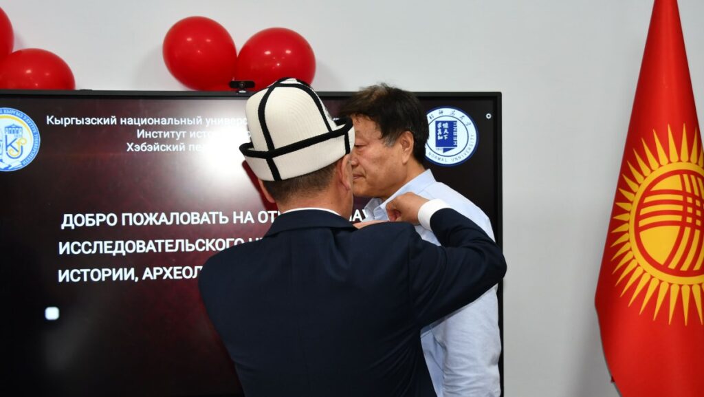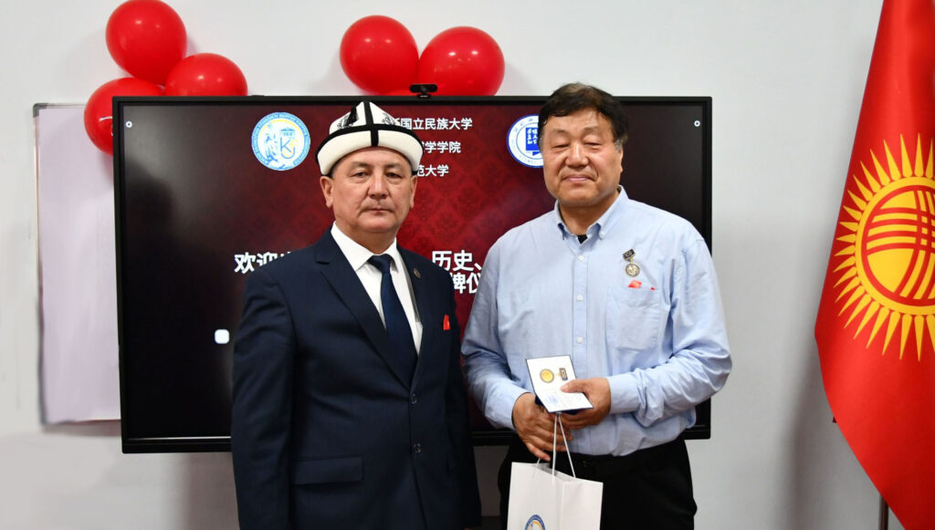 В ходе церемонии Догдурбек Чонтоев наградил г-на Дай Цзянбин юбилейной медалью «100 лет Кыргызскому национальному университету имени Жусупа Баласагына» за большой вклад в научно-образовательное и общественно-культурное развитие страны.