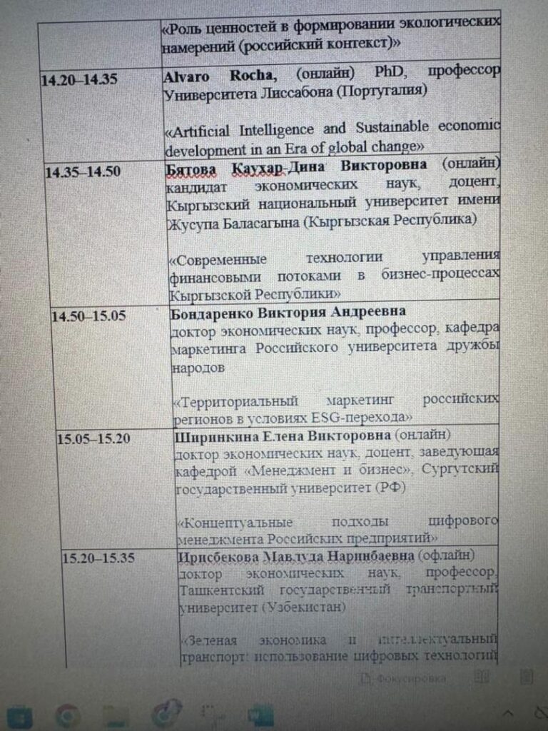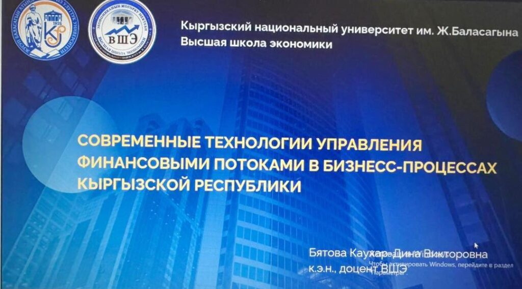 С докладом в онлайн-формате выступила кандидат экономических наук, доцент Высшей школы экономики Бятова Каухар-Дина Викторовна. Тема выступления: «Современные технологии управления финансовыми потоками в бизнес-процессах Кыргызской Республики».