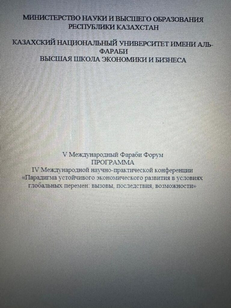 7 апреля 2026 года в рамках V Международного Фараби Форума состоялась IV Международная научно-практическая конференция «Парадигма устойчивого экономического развития в условиях глобальных перемен: вызовы, последствия, возможности», организованная при поддержке Министерство науки и высшего образования Республики Казахстан и Казахского национального университета имени аль-Фараби (Высшая школа экономики и бизнеса).