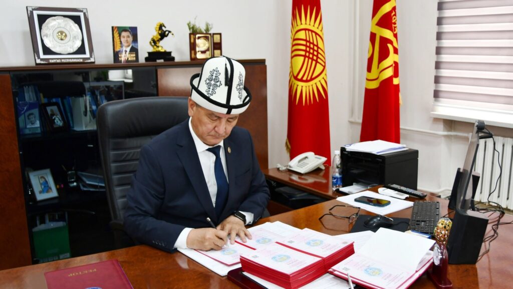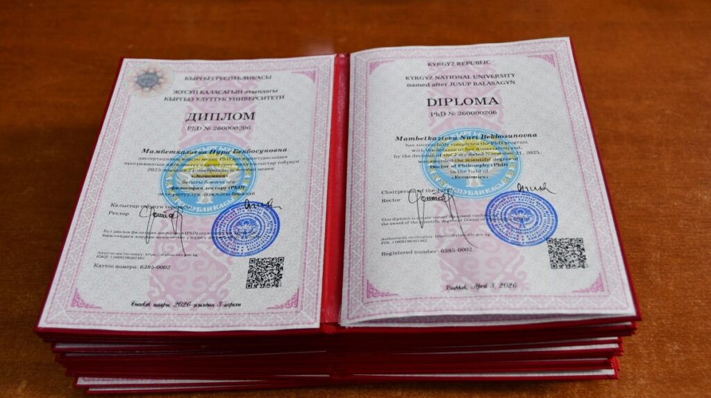 15 апреля 2026 года ректор Кыргызского национального университета имени Жусупа Баласагына, профессор Догдурбек Чонтоев впервые в истории КНУ подписал дипломы докторов философии (PhD).