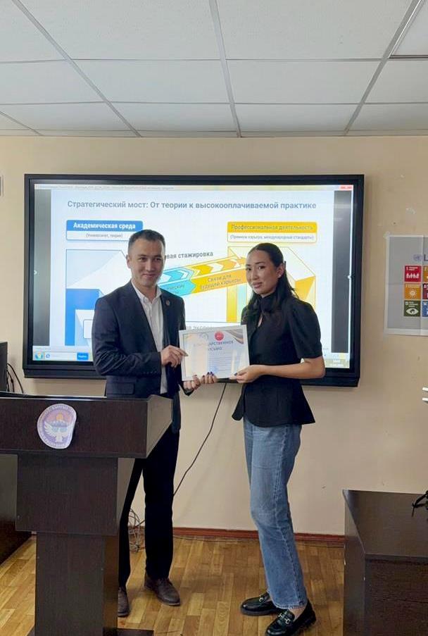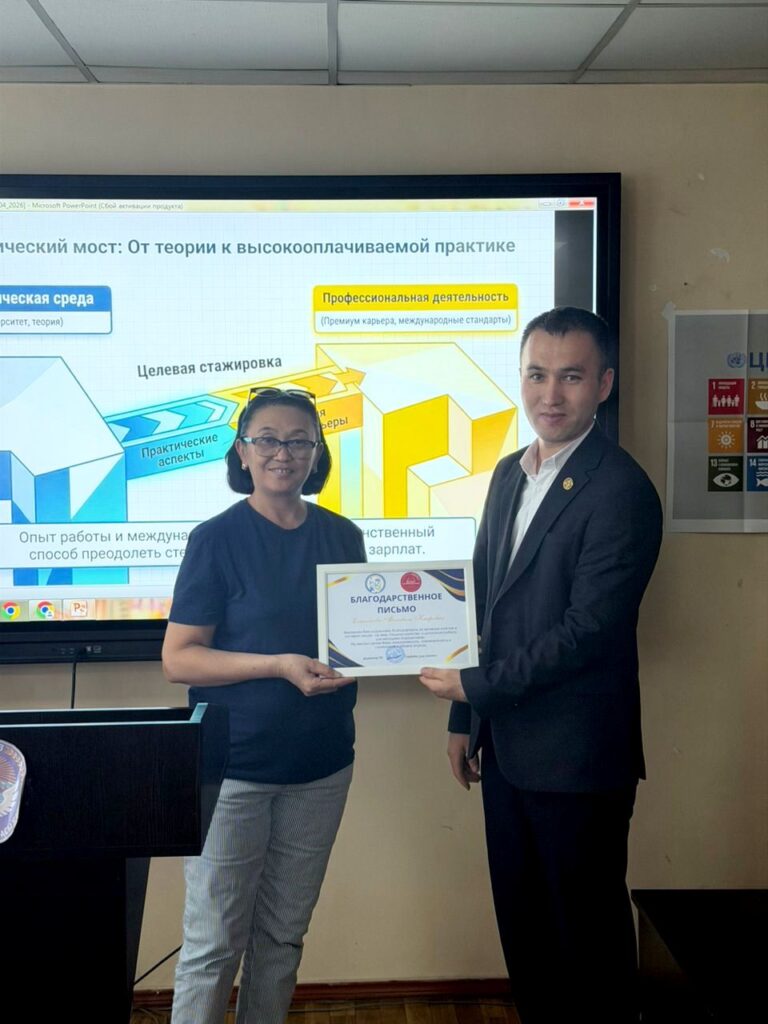 15 апреля 2026 года в рамках реализации Целей устойчивого развития (ЦУР) в Профессиональном колледже состоялась гостевая лекция для студентов 3 курса отделения «Переводческое дело» на тему: «Трудоустройство и достойная работа для молодежи Кыргызстана», направленная на содействие достойной занятости и экономическому росту.