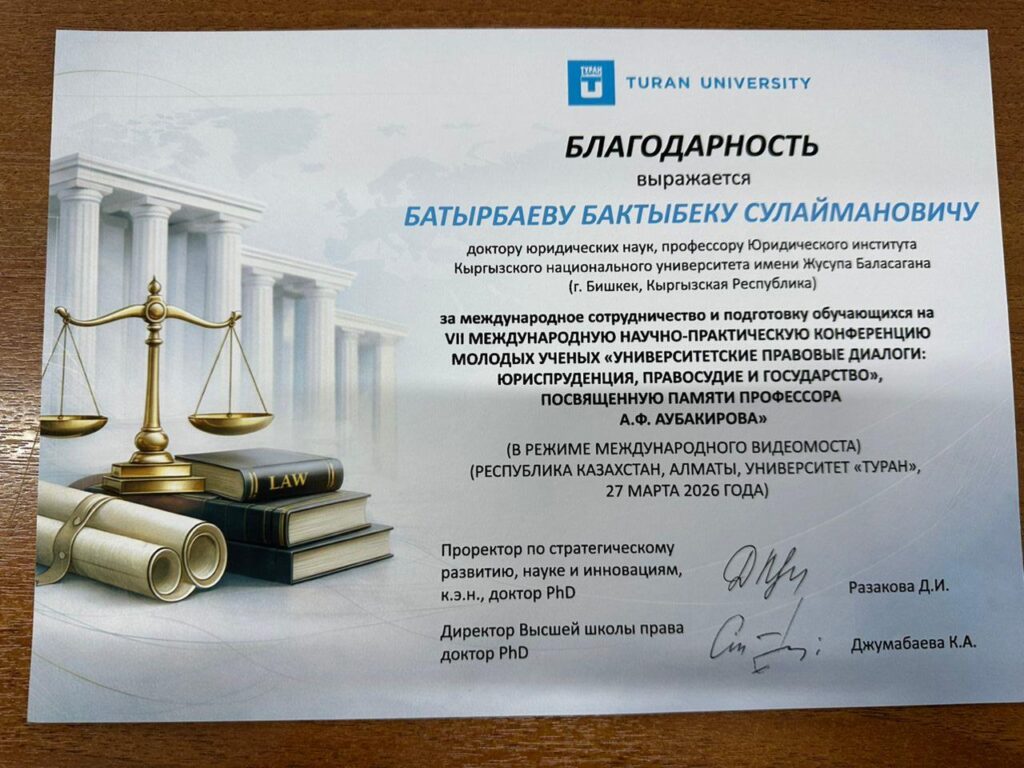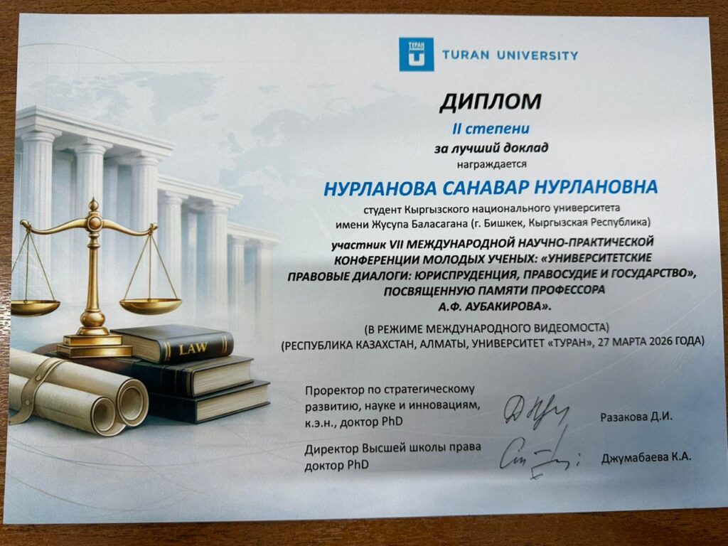Студентка 3 курса очного обучения Юридического института Нурланова Санавар заняла 2 место и была награждена дипломом 2 степени VII международной научно-практической конференции молодых ученых на тему: «Университетские правовые диалоги: юриспруденция, правосудие и государство», а научному руководителю доктору юридических наук, профессору Батырбаеву Бактыбеку Сулаймановичу — благодарность за международное сотрудничество и подготовку обучающихся.